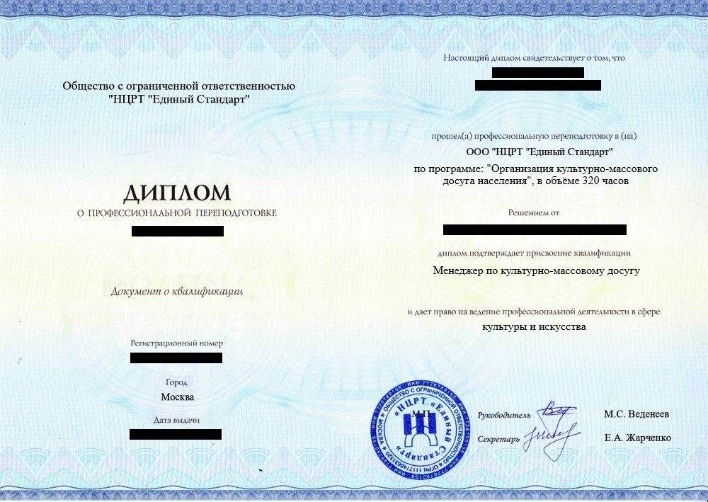 • «Менеджер по культурно-массовому досугу» с правом ведения профессиональной деятельности в сфере культуры и искусства