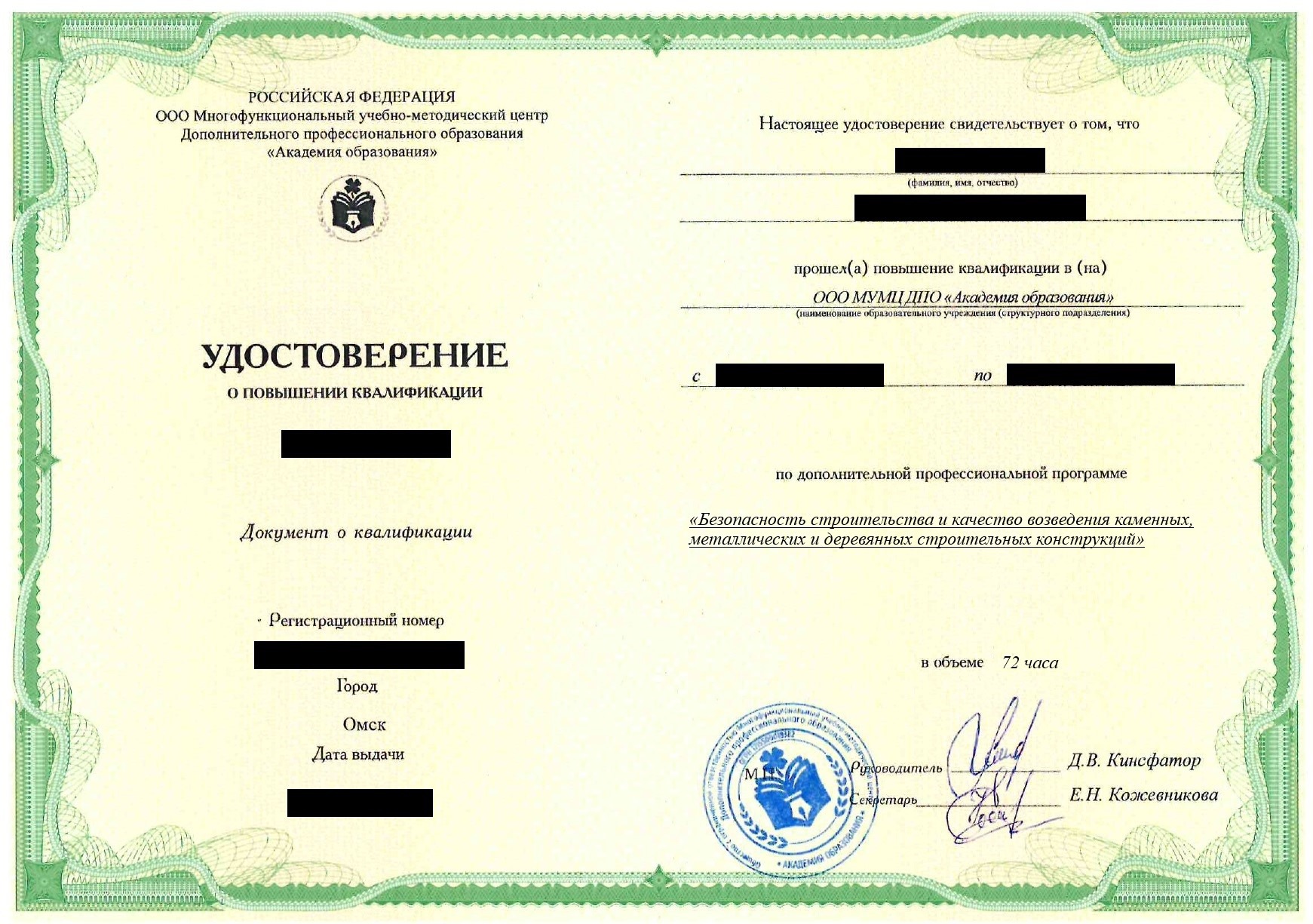• Удостоверение о повышении квалификации установленного государством образца. Срок действия: 5 лет